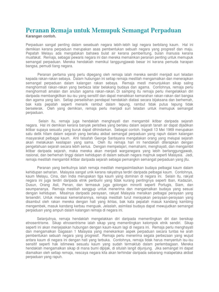 Peranan Remaja Untuk Memupuk Semangat Perpaduan Karangan Contoh